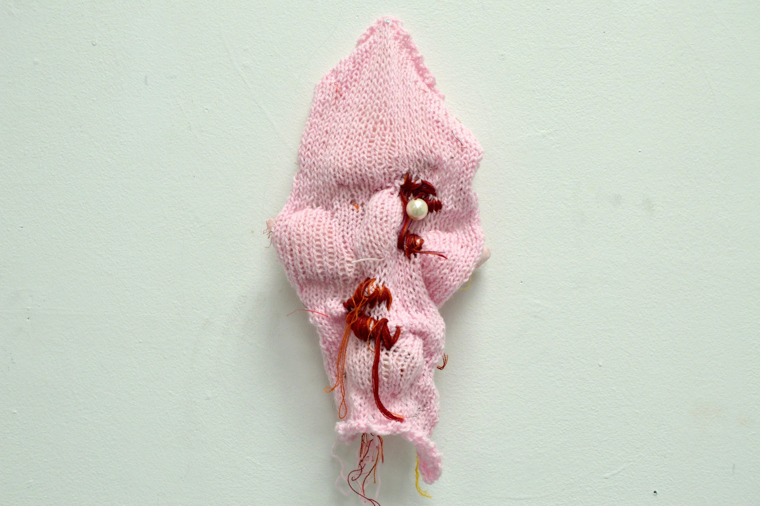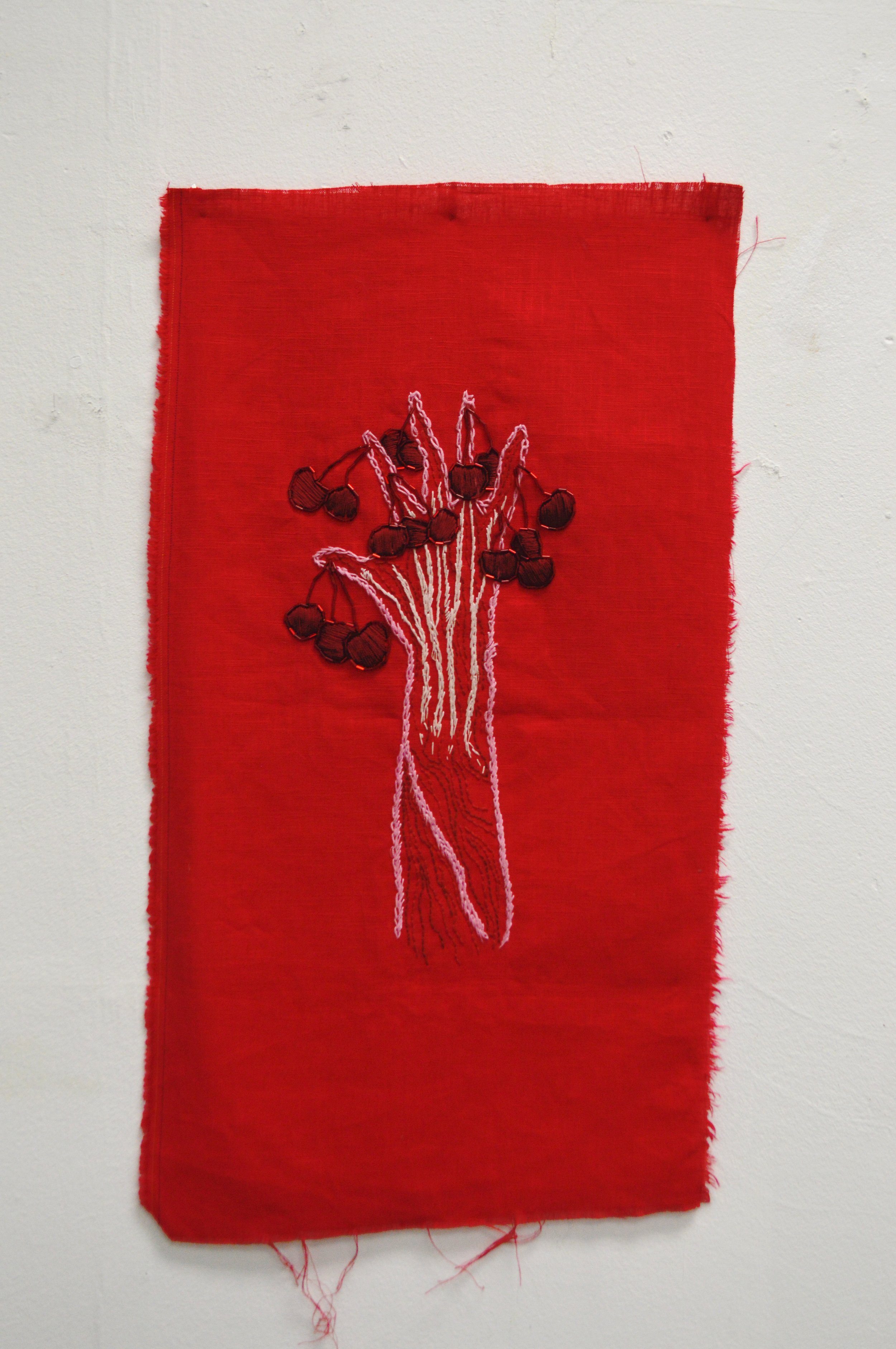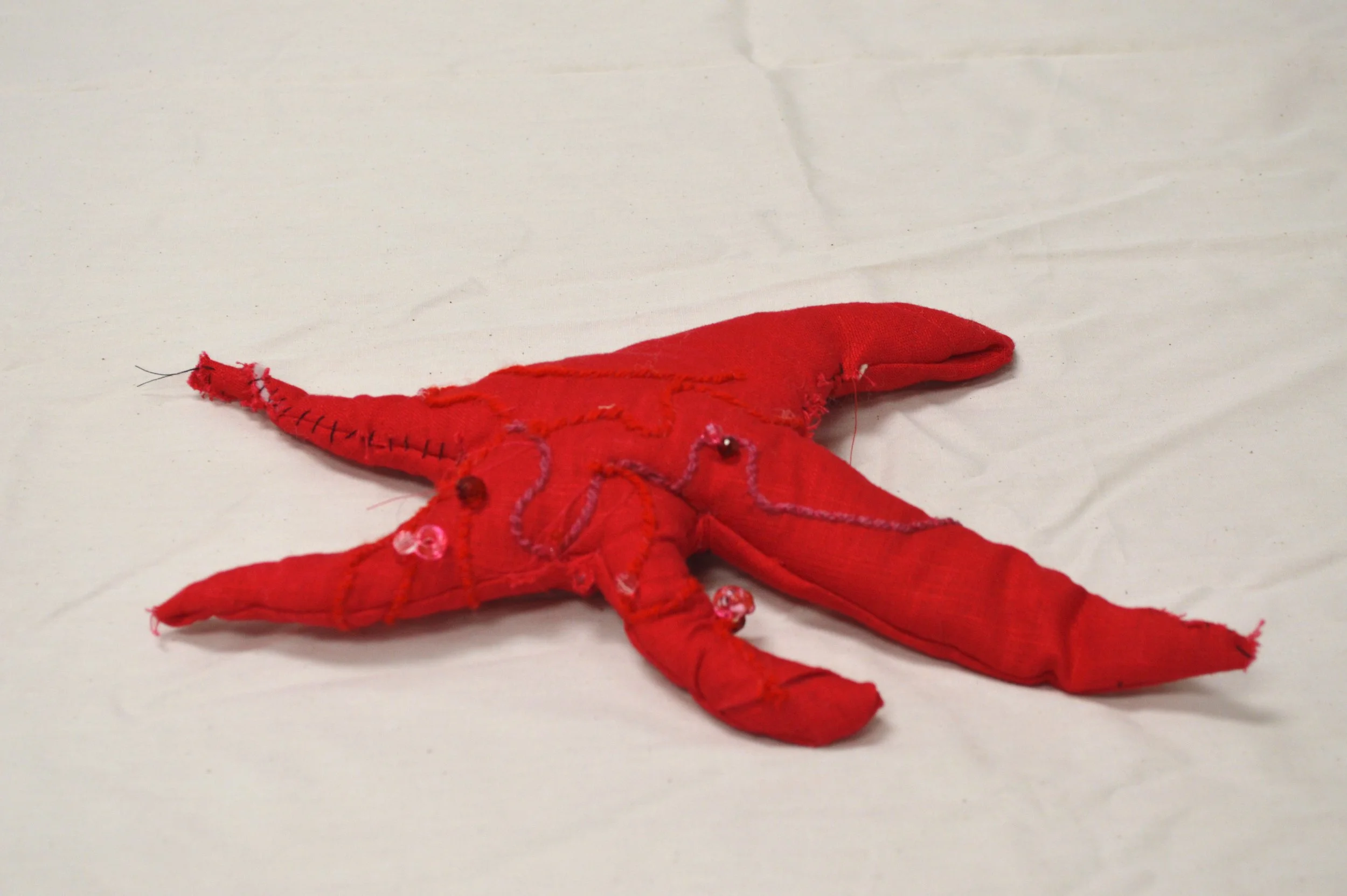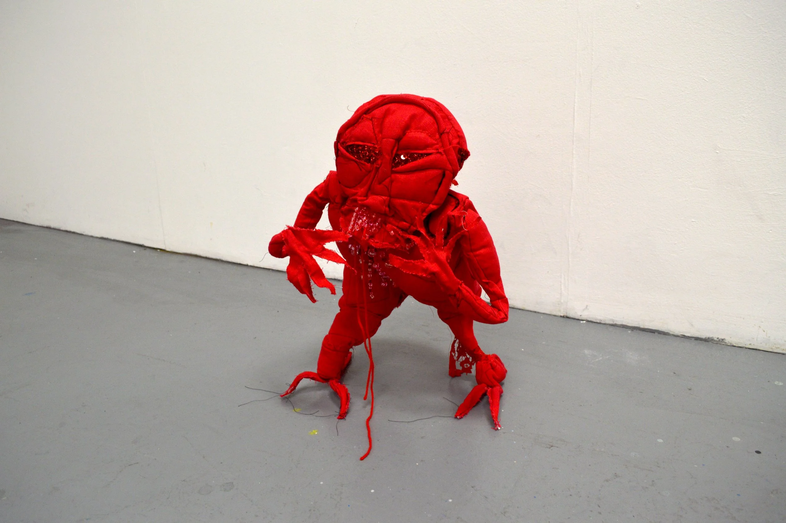 red cotton drill, chicken wire, aluminium wire, stuffing, acrylic yarn, lace, bugle beads, seed beads, sequins.